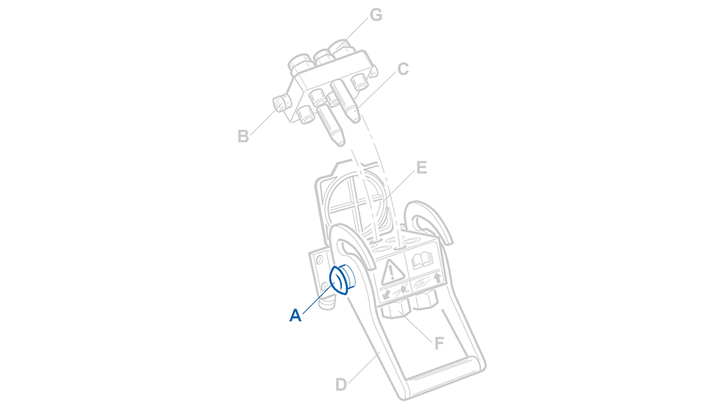 Оригинален бутон за безопасност за бързи съединения Multi-Faster. Бутонът механично заключва лоста върху фиксираната част на плочата, предотвратявайки случайно разкачване на хидравличните линии по време на работа или транспорт. За разкачване бутонът трябва да се натисне. Никога не насилвайте лоста без предварително натискане.