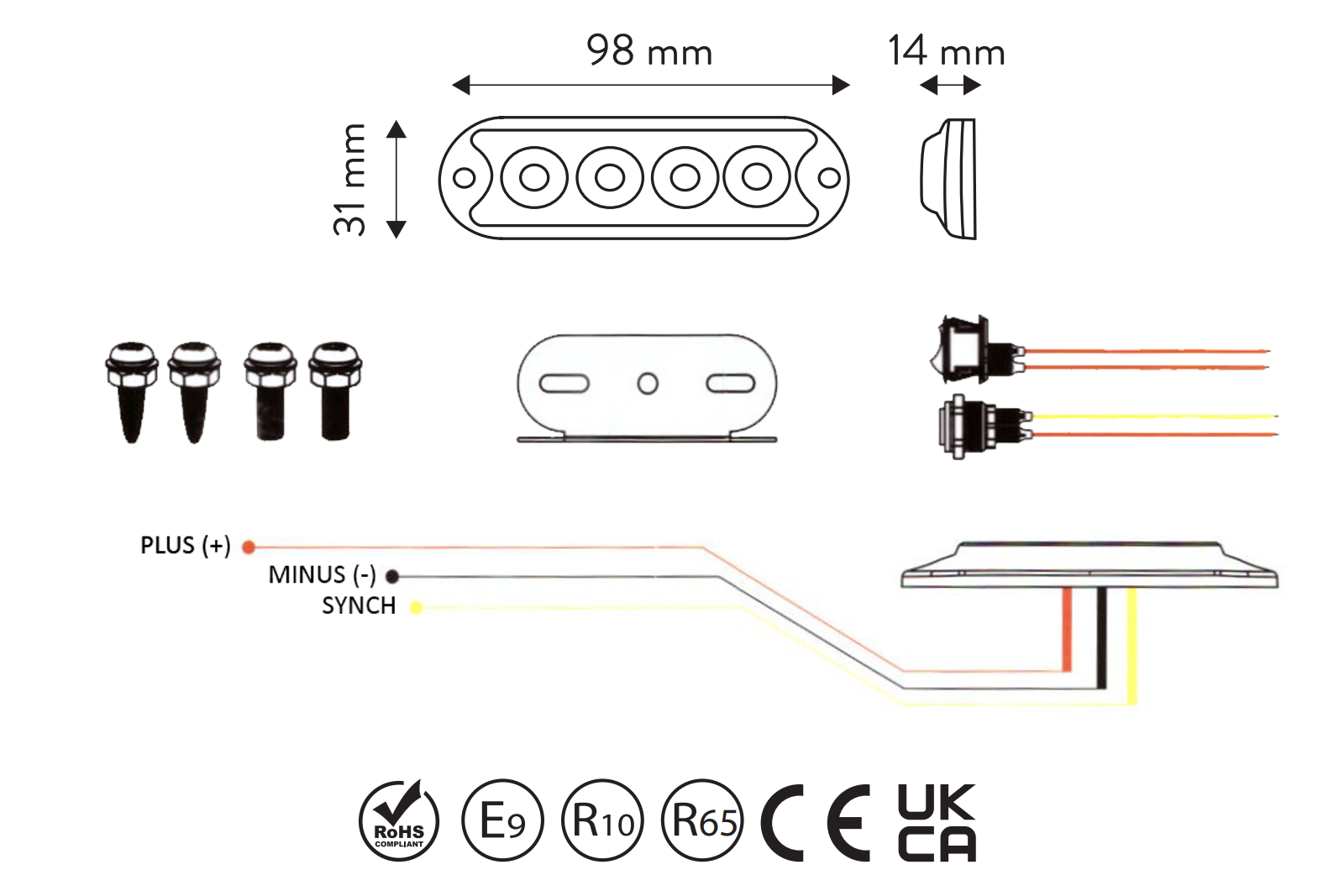 E9, R10, R65, CE, UKCA, ROHS